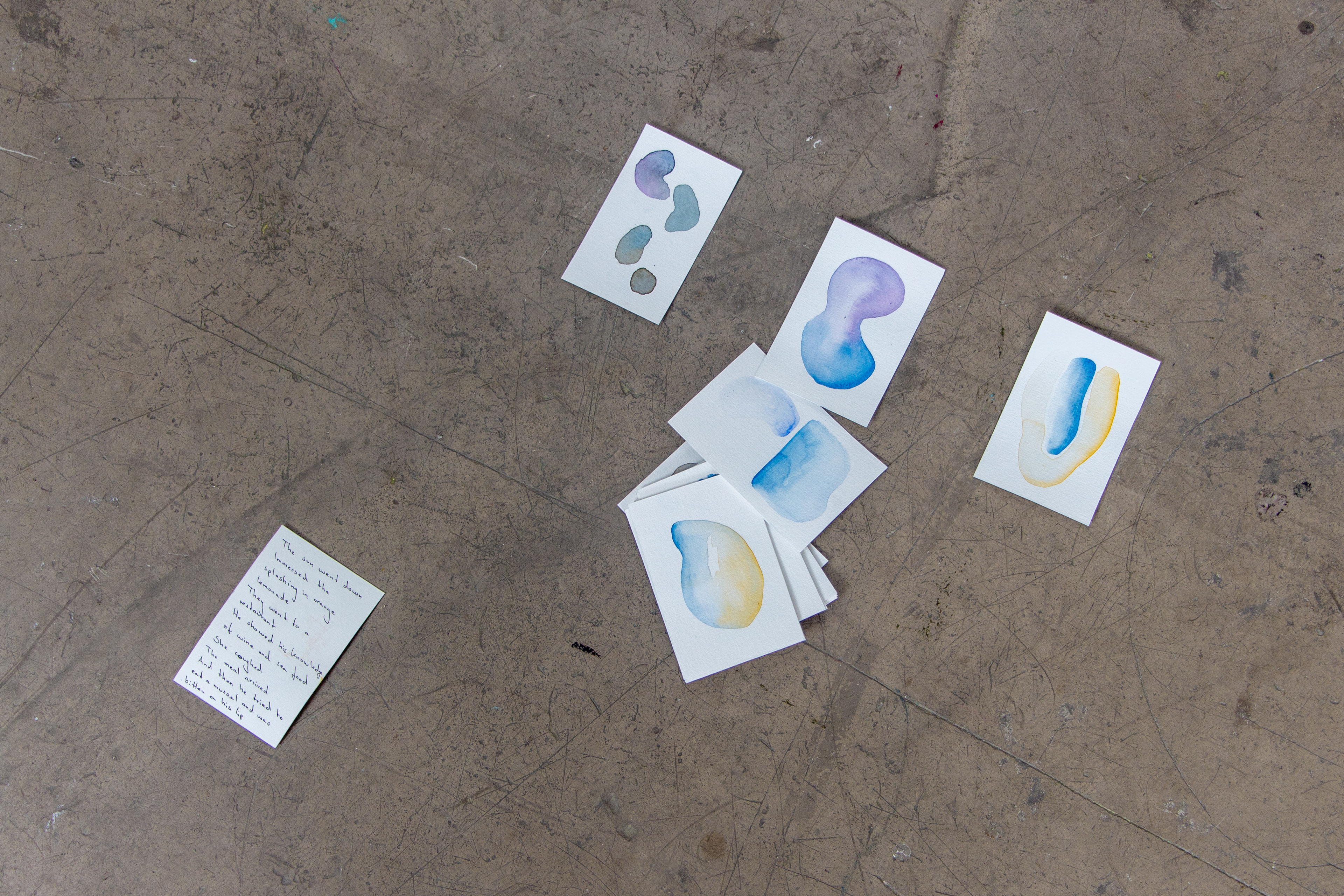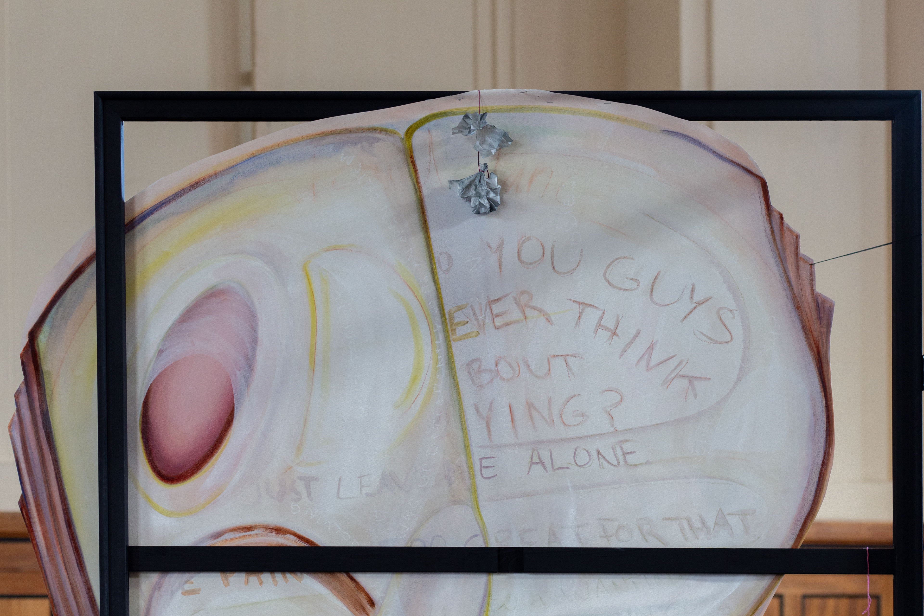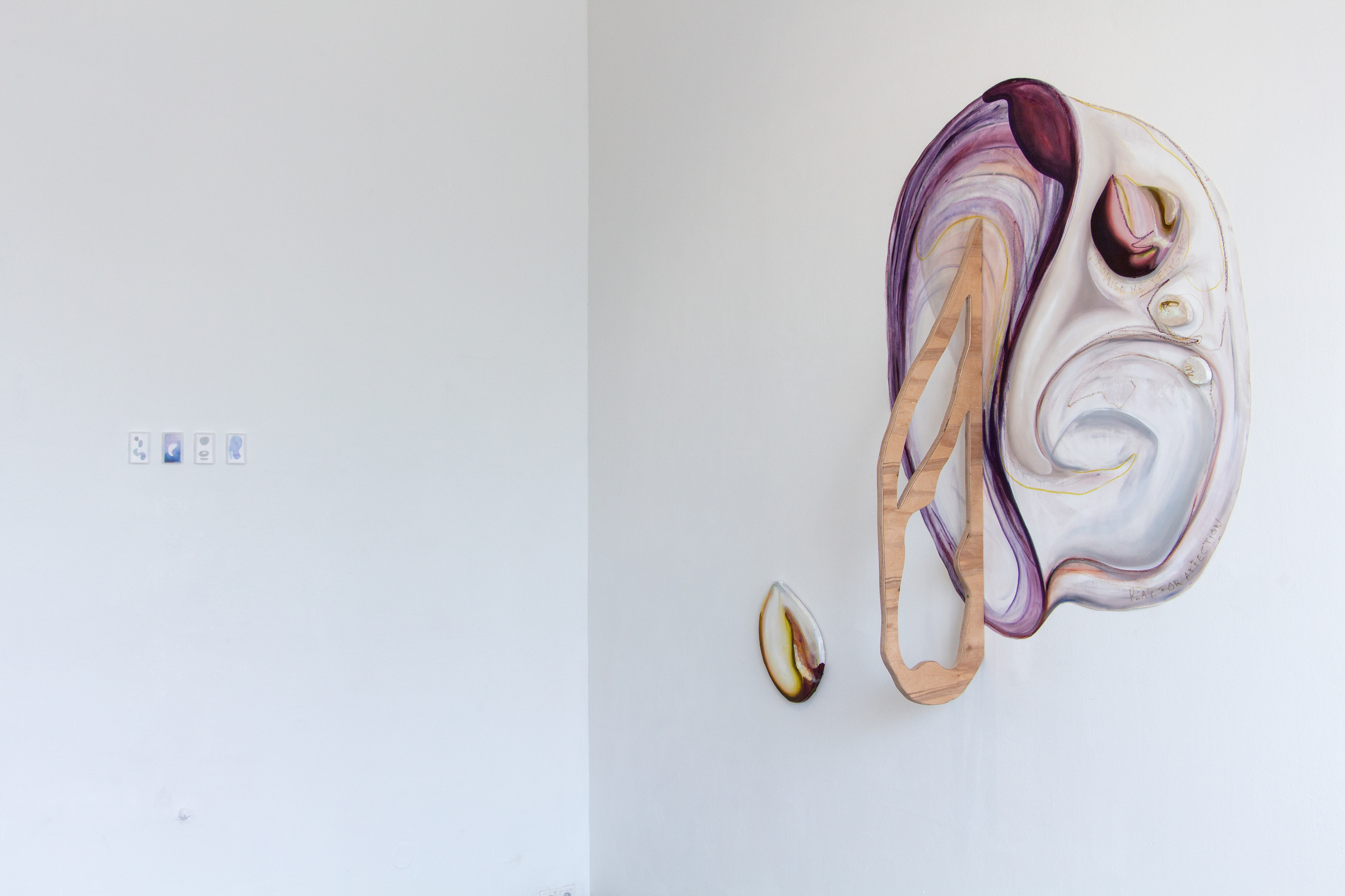 As a continuation of Part I and Part II of Santa María Paraffina, Anne Meerpohl’s work explores growing up by the sea and the shoreline as a passage or threshold where not only stones, seaweed and shells accumulate but also social spaces of power structures are negotiated. A hybrid of painting and sculpture adapts the form of a blue mussel, which is to be found on countless coasts, including the Baltic Sea, where it appears comparatively in a smaller form with a thinner shell. Therefore, shells symbolize not only a protective covering, a cloak, that holds something inside, but also ideals of beauty, gender constructions and sexualized narratives. The canvas becomes a fragile surface, while the frame liquefies as a tear. An accompanying work as a card game offers a playful extension that connects the painting with textual fragments, referencing the social space of negotiation and communal interactions.
