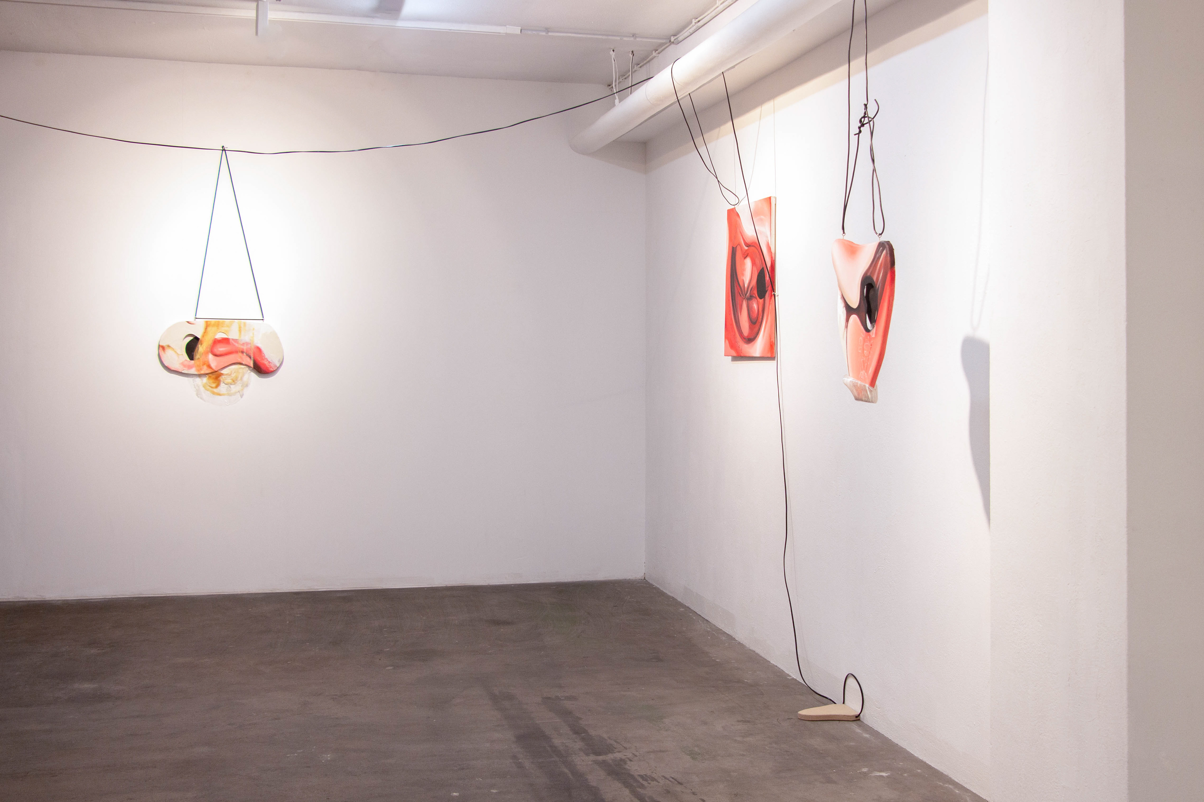 2025, Oil on canvas, wood, foil, cables; exhibition view Bag to the Carrier (Solo), Sender, Hamburg